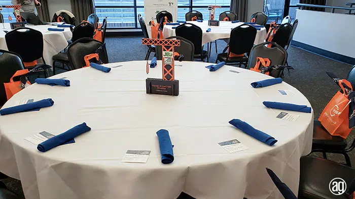 The event was a full-breakfast buffet that celebrated the contributions of women in the construction industry. At the center of each table sat a custom construction crane shaped produced centerpiece.