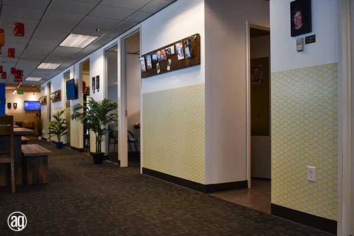 The first thing you notice when you walk into the office is the yellow patterned wall paper. It is hard to miss since it runs almost the entire length of the office. The pattern is created from a symbol used in their language learning software, and the yellow color is frequently used in Rosetta Stone’s branding. A few of the walls in the office are painted completely yellow, and the patterned wallpaper visually complements them nicely.