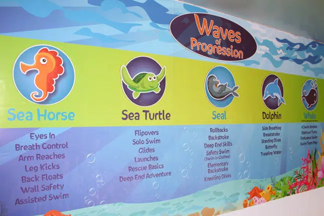 Safe N Sound Swimming is Seattle’s premier, family owned and operated, swimming lessons provider. For the past 27 years they have been teaching kids how to swim and be safe in the water. They designed a large graphic wall piece to visually communicate swimming proficiency levels among their students. The final size was 144.5” x 65.5”. It was to be displayed on a wall of their indoor swimming pool facility.